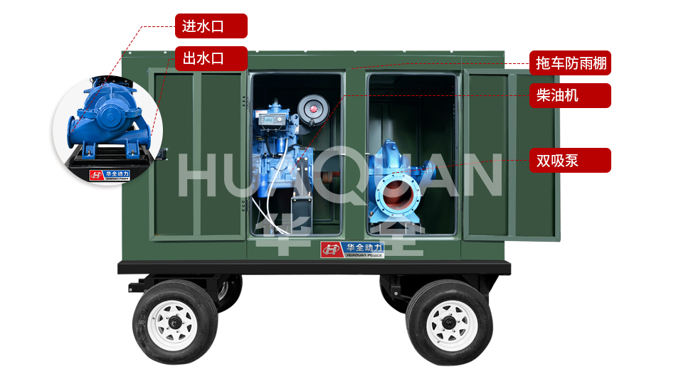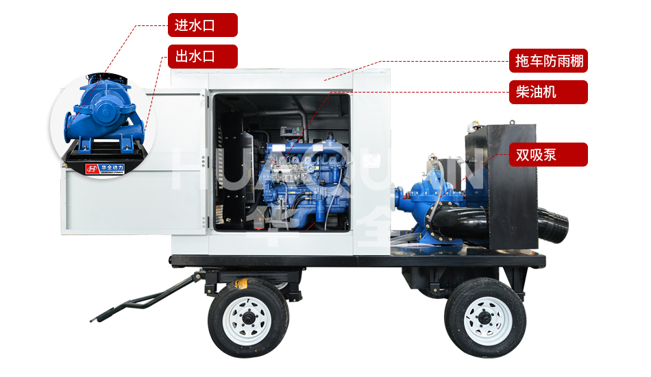 配置:柴油機(jī)+雙吸泵+拖車防雨棚+普通儀表