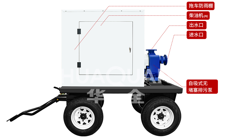| 配置:發動機+ZW100-100-15無堵塞自吸排污泵+拖車防雨棚 | ||